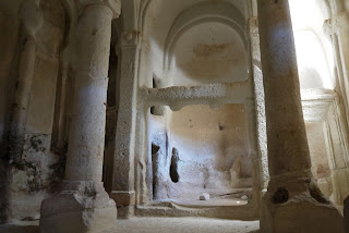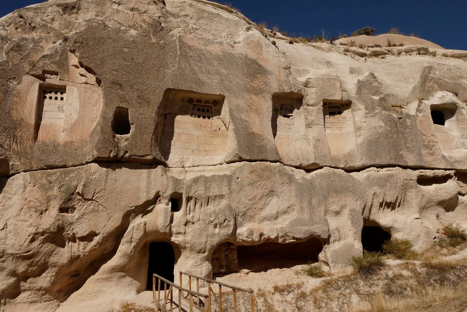 We walked down in Red Valley, before coming back up in order to go in Rose Valley. In between we stopped for lunch on top of a big rock overlooking Red Valley. The views were so great, it felt like our eyes were not big enough to be able to take everything in all at once. After our rest, we walked down Rose Valley. The trail was fun, and we walked by many caves again, some of which we could easily explore. One of them had a little wooden bridge, so we decided to have a look. Turns out it was an amazing church carved inside the rock. From the outside it didn’t look like much, but the inside was definitely worth seeing.