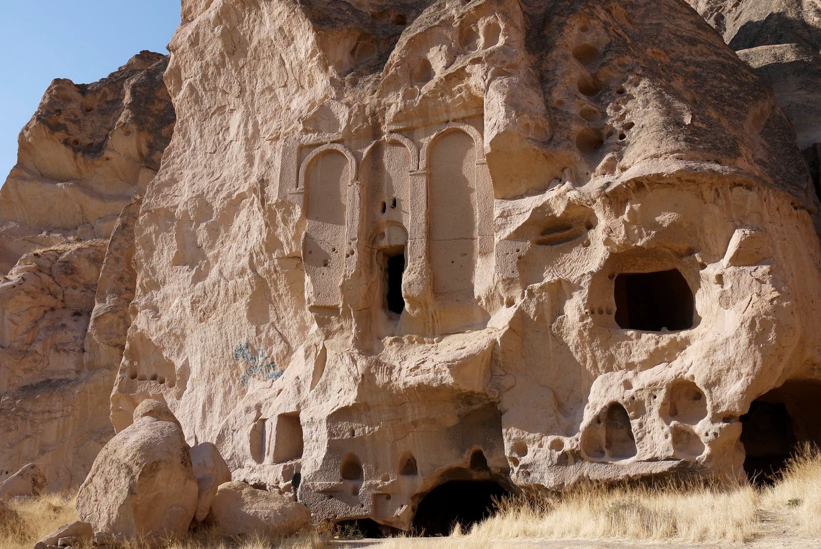It was very interesting to see the frescoes that remain in the churches. They also have different styles, some with columns  others simpler rectangles. After our adventures in Ihlara Valley, we got back in the rental car for a short drive to Selime Cathedral. The Cathedral was also built in the rocks and there are many rooms to explore. It looked different than Ihlara churches mainly because  of the size and the rock type.