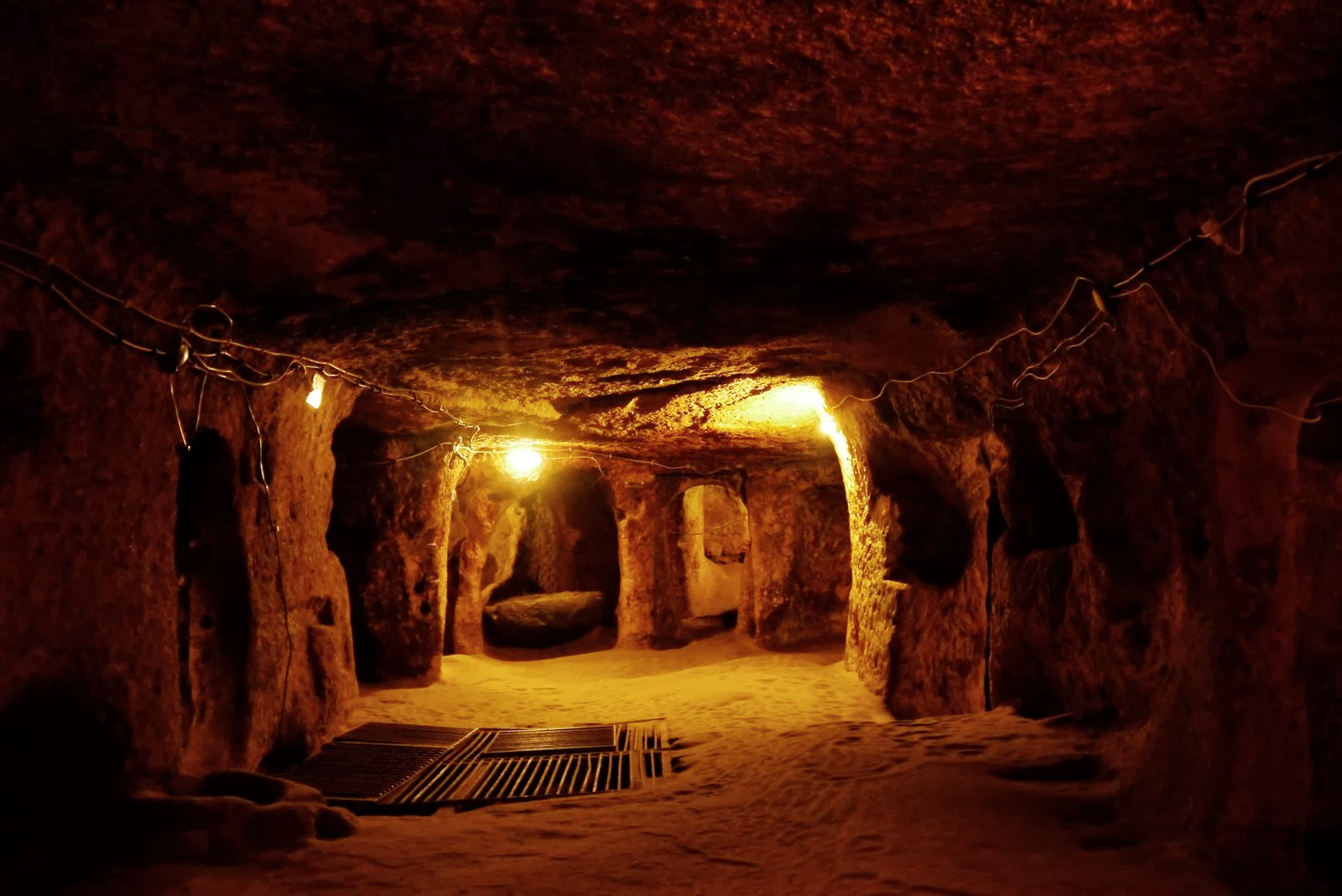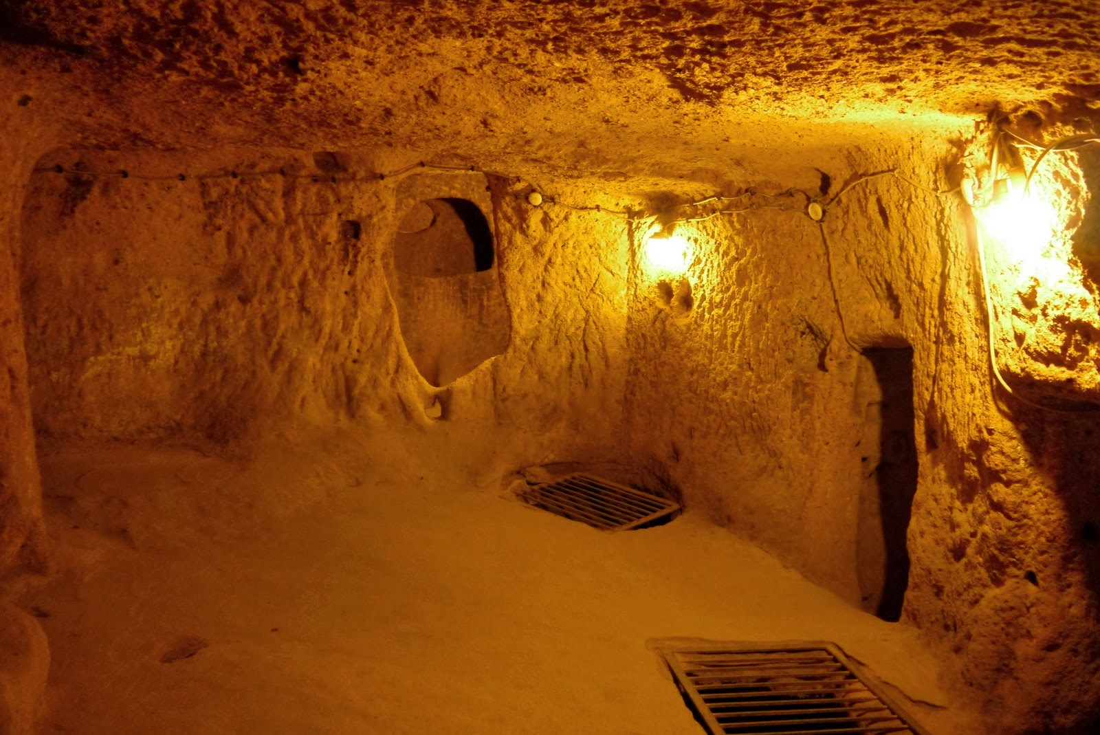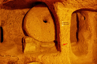 Guides were there, ready to take people on tour and trying to convince us that without a guide we were not going to understand any of it. We politely declined and bought our tickets. The tour is clearly indicated with arrows once you are inside. At the same moment we started our descent, a big group walked by us. During our exploration of Kaymakli, we saw many tour groups. They were all going really fast, just walking by the rooms, not having much time to take good pictures or even try to imagine what was life like for persecuted Christians. We were glad we didn’t pay for a guide as they too were rushing their clients through. We spend a good amount of time in almost every rooms, looking at all the nooks and crannies, taking many pictures and even exploring paths that were not lit. Good thing we had brought our head lamp. We really enjoyed our tour but it probably wouldn’t be as fun if someone was claustrophobic! We had to walk bent over pretty much the entire tour as the rooms and passages were very small. After over an hour, we came back out and drove to Ihlara village to visit the valley and it’s many churches (pictures and story in the next post).