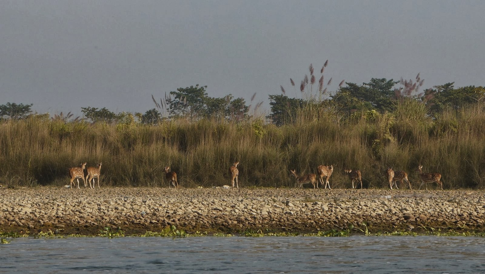 Our second day in Chitwan was spent mostly enjoying the warm weather from our balcony. On our third day, we went for a second safari, this time leaving for a 2 day/1 night tour. We woke up early again and met our guides in town this time. They had already arranged the park entrance permits so we sat in the long wooden boat and started our second expedition on the Rapti River. We saw many birds on our way despite of the thick fog. Our guide was very good, pointing all the different type of birds and the many crocodiles. After about 3 hours of boating, with a small stretching break in the middle, we arrived to the next village. It felt good to be back on dry land after spending the first part of our expedition on small wooden benches which are very hard on the back and bottom.