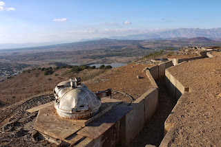 We followed the small road,which looked like a farmer’s private road all the way to a United Nation building. We turned around and kept going on the road, thinking we were going to see the viewpoint. As soon as we started going downhill, we were driving along the Syria, Jordan borders… lined with very tall barbed-wire fences. We kept driving, but soon there was a closed gate. So we turned around. On the other side of the electrified barbed-wire fence, the view seemed really amazing, over the mountains of Jordan and Syria, but we didn’t feel it was the kind of place to stop and snap pictures. We were just worried somebody was going to stop us and ask us what the hell we were doing on the border line, in a rented Smart…