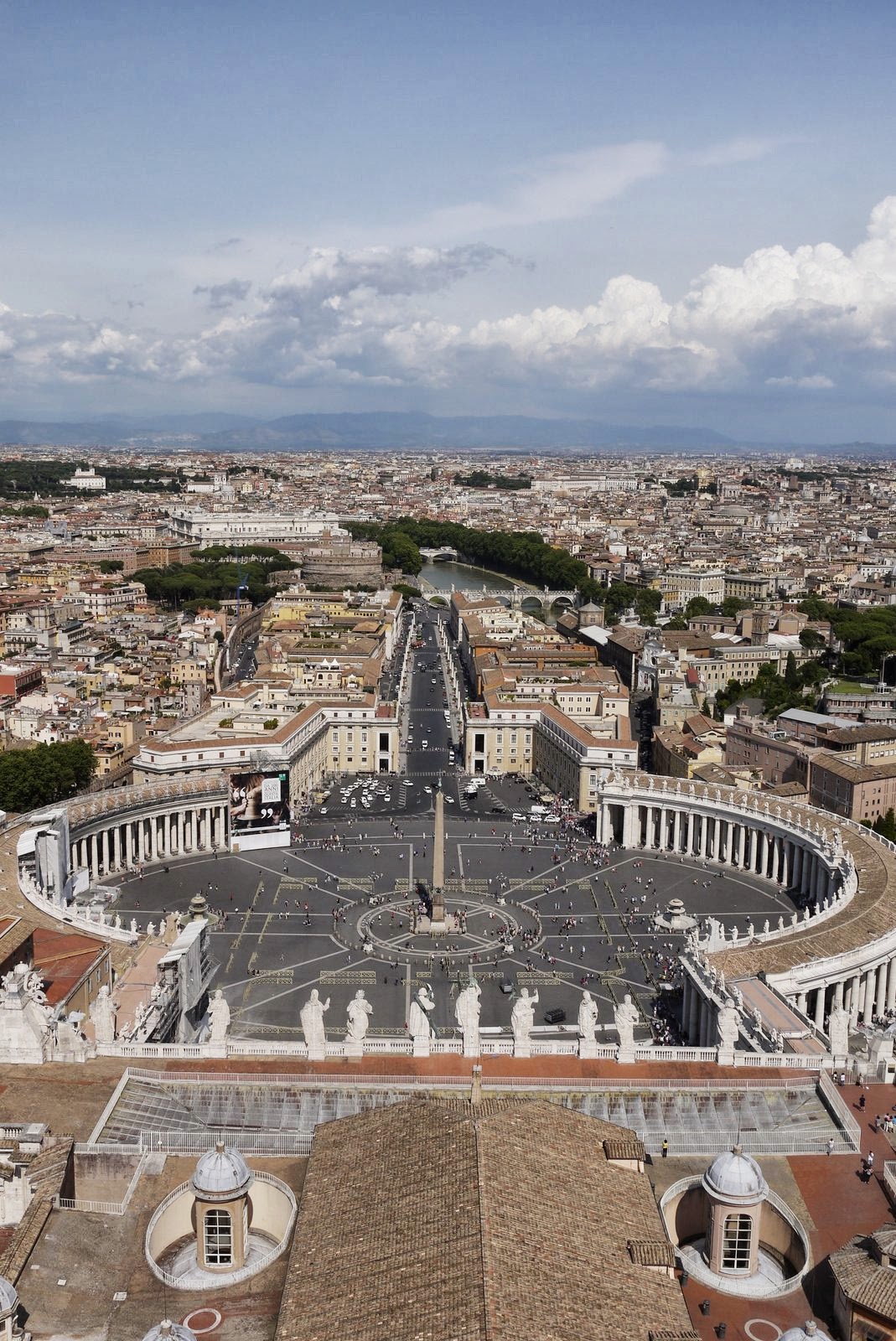 On our second day visiting Rome, we walked in town, visiting Plazza de la Republica, fontena del Triton (unfortunately it was in a box), fontena de Trevi (a lot bigger than we expected.. and really crowded) After losing ourselves in the little streets filed with official shops and random people selling random stuff laid out on blankets, we visited Templo Adriano and the Pantheon. We saw Piazza Navona and walked on street Coronari until Ponte Sant’ Angelo. On the other side of the Fiume Tevere, we saw Castel Sant’ Angelo. We kept walking to the Vatican. The basilica Sant Pietro is HUGE.. and so was the line-up to get in! We met an Australian girl in the line so the 40 minutes wait went by a lot faster. We passed security and decided to start with the Cupole to get a nice view. The stairs are wide at first but get narrow and somewhat steep. There is a nice footbridge almost at the top which allowed us to see the mosaics on the walls. We climbed more stairs, getting narrower (good thing we are not overweight) all the way to the top where a nice view of Roma awaited us. We came back down to visit the actual Basilica. It was really impressive. According to Lonely Planet, if you only have one church to visit in Rome, it should be the Basilica. They were right. After spending quite a bit of time in the Vatican, we walked back to our room.