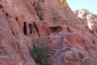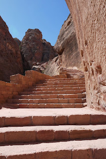 Petra is a huge site, way too big for a one day visit. We started our second day with a ride to the visitor center in the back of a pick-up, Jordanian style, in the box. We then started walking on the path leading to the site. After a little while, we arrived to a point where the path turns left. We went straight, going through Al-Muthlim tunnel. For about 30 minutes, we followed what looks like a river bed, but dry. This path leads to a curved canyon about 3 feet wide, with stripes ranging in colour from orange to purple all over the walls. The rock was amazing. When we got out the canyon, we turned left toward the main sites, seeing some old carved houses and a flight of stairs. We decided to take the stairs up the mountain. There is a path at the top that leads to the Treasury again, but giving us a stunning view from above. We had to come back down the same way. We admired the Sextius Florentinus Tomb Palace Tomb, Corinthian Tomb, Silk Tomb and Urn Tomb before exploring the Street of Facades.