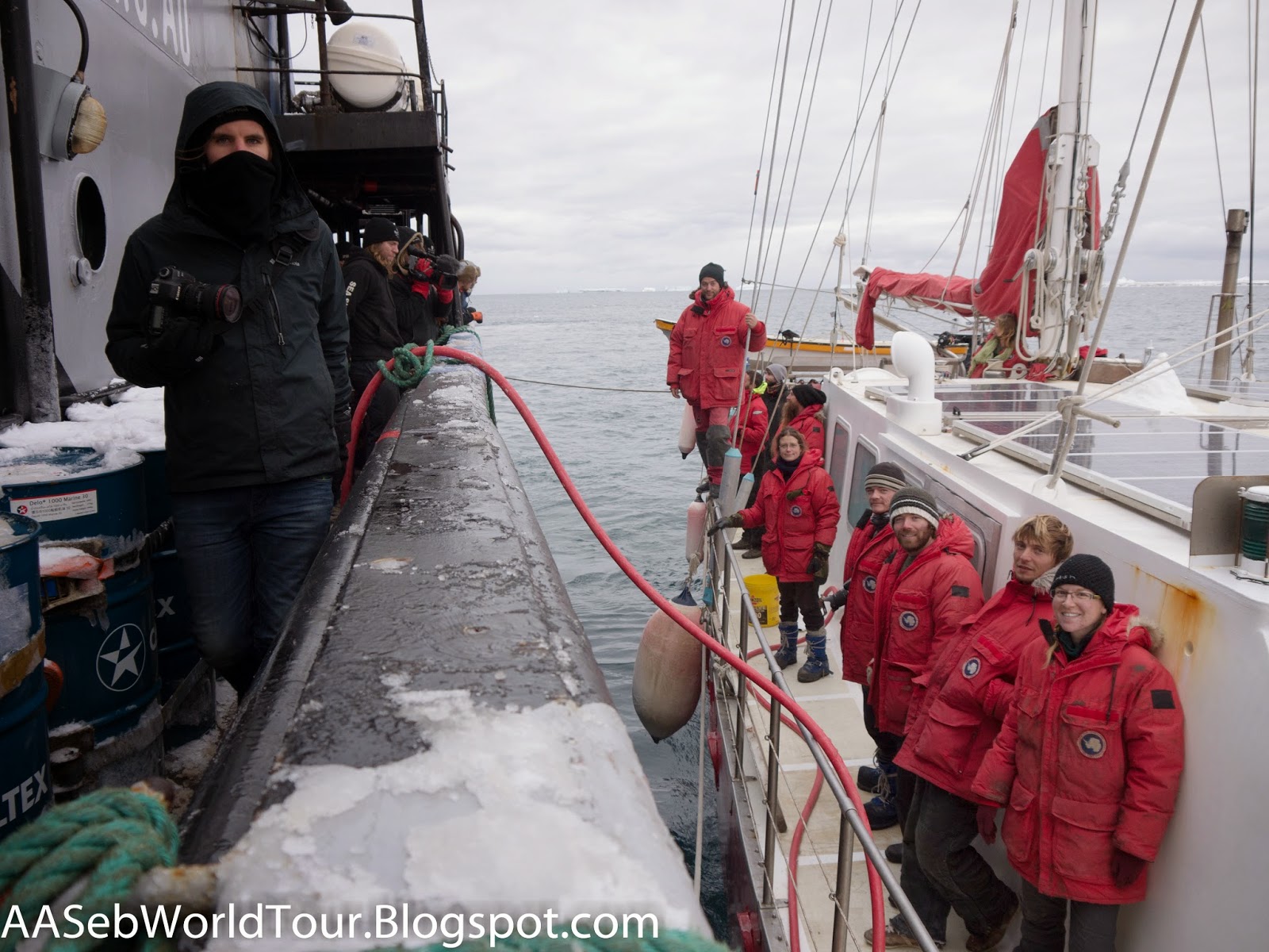 After the Japanese realized their mistake, we returned to our anchorage spot in Ridley Beach so the last group of people could go ashore. Later in the day, the Steve Irwin came back towards us, unfortunately followed by the Japanese ship. We attached our boat to theirs and they transferred quite a lot of fuel to top up our tanks as their thank you for helping them. It was very funny to see everybody excited to meet new people, on both boats, as they too had been at sea for a long time. After the fuel transfer, we went out of the bay and south into the Ross Sea, hoping to reach a different anchorage in prevision of the storm that was coming up our way.